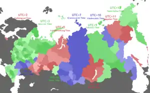 Час у Росії: у столиці країни, у Москві — UTC+3 (+1 година різниці часу з Києвом)[8]. Територія держави лежить у 11 годинних поясах (2 було додано 2014 року):