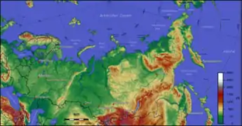 Середні висоти — 600 м; найнижча точка — рівень Каспійського моря (-28 м); найвища точка — гора Ельбрус (5633 м) на Кавказі, це також найвища вершина Європи. Умовно рельєф Росії можна розділити по Єнісею на західну рівнинну частину і східну — підвищену, гірську. Рівнинна західна частина країни складається із Східноєвропейської рівнини і Західносибірської низовини, розділених Уральськими горами майже навпіл. На півдні підіймаються гори Кавказу, на північному заході — гори Хібіни. Східна гірська половина країни в центрі й на півночі ділиться річкою Лена на дві частини: Середньосибірське плоскогір'я і Індигіро-Колимську гірську країну. На півдні гірської половини країни підіймаються гори Алтаю, Забайкалля, Джугджур і Сіхоте-Аліню[10].