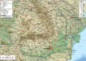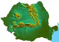 Значну частину території Румунії займають гори (30 %) і височини (37 %). У північних і центральних районах розташовані Східні (найвища точка — гора П'єтрос, 2305 м) і Південні Карпати, або Трансильванські Альпи (найвища точка — гора Молдовяну, 2544 м), які утворюють у плані кільцеподібну структуру, що займає 2/5 площі країни[2][3]. Східні й Південні Карпати розділяє долина річки Прахова і перевал Предял[2]. Карпати мають чимало зручних перевалів і не є природним непрохідним бар'єром для транспортних зв'язків[4]. На захід від долини річки Мурешул — середньовисотні Західні Румунські гори, або Апусені (рум. Munţii Apuseni)[2]. Між ними і Карпатами знаходиться Трансильванське плато (250—800 м). На півдні Румунії розташована Нижньодунайська рівнина (Валахська), обмежена річкою Дунай, на заході — Західна рівнина (Притисенська), частина Середньодунайської рівнини. На схід від річки Серет — Молдавське плато, на південний-схід за Дунаєм — плато Добруджа[3].