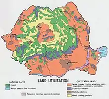 Значна частина країни розорана, особливо родючі чорноземи й алювіальні ґрунти Нижньодунайської низовини. Для підвищення родючості на низовинах проводиться система меліоративних заходів: зрошування, осушення, будівництво дамб[2]. Торф'яно-болотисті ґрунти дельти Дунаю майже непридатні для господарського використання. Трансільванське плато сильно еродоване, лише в його південній частині розташовується зручний для землеробства Трансільванський степ.