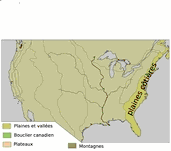 - Аппалачі — гірський край, що тягнеться на 1900 км від північної частини штату Мен до центральної частини штату Алабама. Тут розташовані всі значні гірські вершини сходу США, з них не менше 20 перевищують 1520 м і 8 — 1830 м. У складі регіону виділяють наступні райони: Підмонт, гори Блу-Рідж, Хребти і Долини, Аппалачське плато, гори Адірондак, долина річки Св. Лаврентія і Нова Англія.