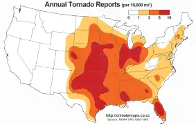 Західне тихоокеанське узбережжя має подібний до середземноморського клімат, з максимумом атмосферних опадів взимку й посухами влітку. Гірські райони Кордильєр мають більш спекотну посушливу погоду, взимку — можливий сніг і приморозки. Рівнинні штати відзначаються рівномірним розподілом опадів за сезонами. Зіткнення арктичного повітря з прогрітим тропічним призводить до утворення торнадо на так званій «алеї торнадо» центральних рівнин. На атлантичному східному узбережжі влітку спекотно й волого, сезон дощів, взимку — відносно прохолодно й посушливо[12].