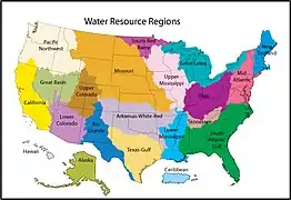 Річки більшої частини території країни належать басейну Атлантичного океану: Міссісіпі з притоками Міссурі і Огайо, Ріо-Гранде. На захід від Кольдир'єр — басейну Тихого океану: Колумбія і Колорадо, Юкон з Кускокуїмом на Алясці, річки Гавайських островів. Річки, що беруть свій початок на хребті Брукс, належать до басейну Північного Льодовитого океану.