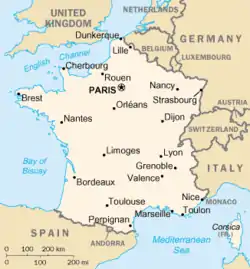 Франція — держава на заході Європи, республіка, що межує на північному сході з Бельгією і Німеччиною, на сході з Німеччиною, Швейцарією й Італією, південному-сході з Іспанією й Андоррою, на півдні омивається Середземним морем, на заході — Атлантичним океаном. Площа (разом з Корсикою) 543 965 км².