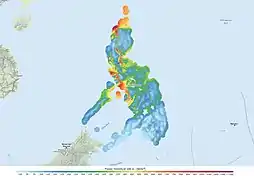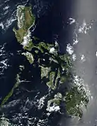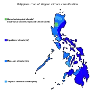 Територія Філіппін лежить у субекваторіальному кліматичному поясі[16]. Влітку переважають екваторіальні повітряні маси, взимку — тропічні[17]. Влітку вітри дмуть від, а взимку до екватора. Сезонні амплітуди температури повітря незначні, зимовий період не набагато прохолодніший за літній[17]. Зволоження достатнє. У літньо-осінній період з морів та океанів часто надходять руйнівні тропічні циклони (тайфуни)[17]. Клімат Філіппін через сильну розчленованість рельєфу, різну експозицію схилів щодо вологих мусонних потоків і трас тропічних циклонів, неоднакову міру віддаленості місцевості від океану, досить неоднорідний і сильно залежить від місцевості.