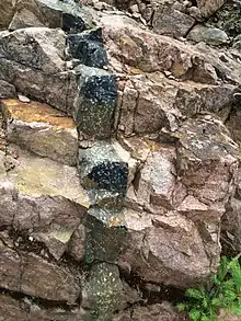 - Інтрузивні контакти - це поверхні між приймаючою скелею та магматичним тілом. Старіша гірська порода скелі перетинається молодшим магматичним тілом. Характер вторгнутого тіла залежить від його складу та глибини. Поширені приклади - магматичні дамби, підвіконня, плутони та батоліти. Залежно від складу магми, інтрузивне тіло може мати складну внутрішню структуру, яка може забезпечити уявлення про його зміщення.