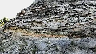 - Алевроліти сірі, аналогічні верхньому шару. У нижній частині шару спостерігаються численні відбитки переважно голонасінних рослин.
