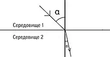 При цьому , де α — це кут падіння, Β — це кут заломлення, -показник заломлення першого середовища, -показник заломлення другого середовища.