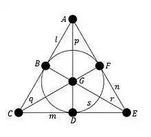 Ця знаменита геометрія інцидентності була розроблена італійським математиком Джино Фано. У його роботі[8] з доведення незалежності множини аксіом для проєктивного n-простору, яку він розробляв[9], він створив скінченний тривимірний простір з 15 точками, 35 прямими і 15 площинами, в якому кожна пряма містить тільки три точки[10]. Площини в цьому просторі складаються з семи точок і семи прямих, які відомі як площини Фано.
