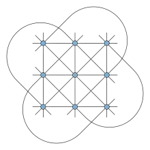 12 прямих можуть бути розбиті на чотири класи, всередині яких прямі попарно не перетинаються. Ці класи називаються класами паралельності прямих. Якщо додати ще чотири нові точки, по одній точці в кожен клас паралельності, і вважати, що всі прямі класу паралельності перетинаються в цій новій точці (таким чином, тепер всі прямі перетинаються), і додати ще одну пряму, яка містить всі чотири нові точки, отримаємо проєктивну площину порядку три, конфігурацію (134). У зворотний бік, почавши з проєктивної площини порядку три (така площина єдина) і видаливши будь-яку (одну) пряму і всі точки, що лежать на ній, отримаємо афінну площину порядку три (вона теж єдина).
