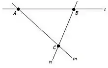 - Для будь-якої точки A і прямої l, не інцидентної точці (антипрапор), існує рівно одна пряма m, інцидентна A (тобто A I m), яка не перетинає l (аксіома Плейфера)