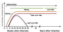 Невдовзі після появи HBsAg, з'явиться інший антиген гепатиту B, названий HBeAg. Зазвичай наявність HBeAg в плазмі пов'язують з набагато вищими рівнями реплікації вірусу і збільшеною заразністю; але деякі варіанти вірусу не завжди виробляють антиген 'e' тому це правило не завжди спрацьовує. Протягом природного перебігу хвороби, HBeAg може очиститись і антитіла до антигену 'e' (anti-HBe) з'являться одразу після цього. Зазвичай це пов'язано з критичним зниженням активності реплікації вірусу.