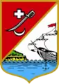 У правому, срібному полі внизу зображена вода, з правого боку берег, а з лівого — ніс корабля, з якого опускається якір у воду, в пам'ять про відкритий порт.