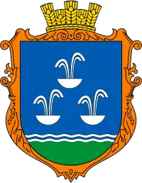 У синьому полі три срібні фонтани (один над двома), над відділеною трьома нитяними балками (срібною, синьою та срібною) зеленою основою.