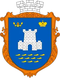У лазуровому французькому щиті — срібна фортечна вежа зі стінами і відкритим прорізом воріт, що супроводжується вгорі справа золотою візантійською, угорі зліва — золотою ж російською імператорськими коронами. Біля підніжжя вежі — 12 золотих хвиль у три ряди 5-4-3.