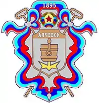 На лазуровому щиті золотий ківш з срібним металом, який ллється в золоте підніжжя. На золотій главі чорний напис АЛЧЕВСЬК.