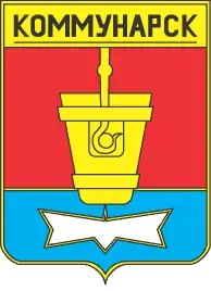 Герб являє собою червоний щит із блакитним підніжжям і золотим чолом. На щиті зображено золотий ківш, з якого виливається розплавлений метал срібного кольору. Метал утворює стилізовану п'ятикутну зірку в базі. На чолі напис чорним кольором «Комунарськ» (назва Алчевська в цей час).