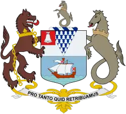 У нижній частині герба є чорний латинський девіз «Pro tanto quid retribuamus" на білій стрічці. Він взятий із Псалма 116 Вірша 12 у Біблії Латинської Вульгати, і це буквально "За (Про) стільки (tanto), що (quid) ми повернемо (retribuamus)" Вірш перекладається в бібліях по-різному - наприклад, як "Що я можу віддати Господу за всі його блага?.[3] Це також перекладається як "Натомість за стільки, що ми повернемо?"[4]