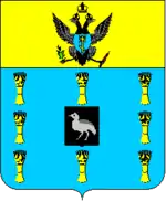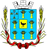 | У синьому полі чорний серцевий щиток із золотою дрофою, оточений вісьмома золотими хлібними снопами. |
