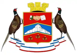 На червоному щиті ламаний лазуровий пояс, обтяжений срібною горою і супроводжується згори двома долонями природного кольору, з'єднаними в рукостисканні, права в срібному мундирі з зеленими обшлагами, ліва в срібному халаті, і знизу трьома дубовими гілками, одна і дві, кожна з двома листками і одним жолудем.