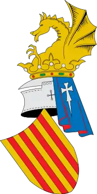 У місті Валенсія арагонський королівський герб із нахиленим щитом, шоломом, мантією, короною та клейнодом зображено на фасаді Лонха-де-ла-Седа, Воротах Серраноса та вежі Кварта.