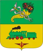 Щит перетятий зеленим і золотим. У верхньому навхрест ріг достатку та кадукей, у нижньому їде паровоз, під яким – залізничний символ.