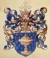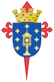 Щит покритий золотою королівською короною із червоною шапочкою, дорогоцінним камінням, складена з восьми розеток-акантусів, п'ять з яких видимих, із перлами. Із кожного його листя виходять п'ять дуг, що прикрашені з перлів, що сходяться під синьою державою, із золотими напівмерідіаном, екватором та хрестом.