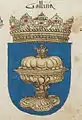 Герби європейських королівств з гербовником Йогана Зібмахера (1605 р.)[2] Герб Королівства Галісії, золота чаша на блакитному тлі, зображений на гербі короля Іспанії