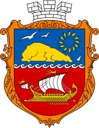 Щит перетятий вузькою балкою срібних хвиль, у верхньому синьому полі стилізована під ведмедя золота гора, над якою вгорі дві срібні чайки та золоте 12-променеве сонце, а зліва внизу – срібне вітрило, у нижньому червоному полі золота антична галера зі срібним вітрилом.