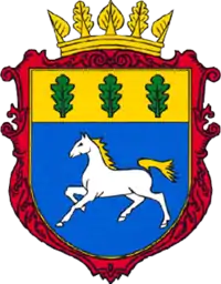 Гербовий щит має форму прямокутника з півколом в основі. У синьому полі біжить срібний кінь із золотою гривою та хвостом, у золотій главі — три зелені дубові листки.