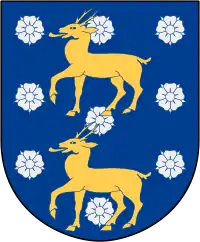 У синьому полі золотий олень із червоними рогами, коміром, язиком і копитами.