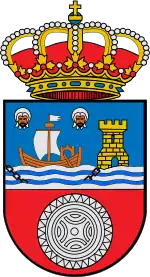 Щит покритий королівською короною, яка являє собою золоте коло, прикрашене дорогоцінними каменями, що складається з восьми кінцівок, з рослинних прикрас, п'ятьох видимих, увінчаних перлинами і чиї листя виходять з півдуги, які сходяться в синій кулі, з напівмеридіаном і золотим екватором увінчаним золотим хрестом. Корона підбита червоним.