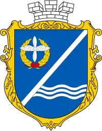 Лазуровий щит поділений срібним вузьким перев'язом зліва; у першій частині золотий лавровий вінок, перев'язаний червоною стрічкою, на який покладені срібні лет і пропелер; у другій — три срібні вузькі хвилясті понижені пояси.