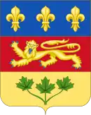 Tiercé en fasce; d'azur, à trois fleurs-de-lis d'or; de gueules, à un léopard d'or, armé et lampassé d'azur; d'or, à une branche d'érable à sucre à triple feuille de sinople, aux nervures du champ. Timbré de la couronne royale. Sous l'écu, un listel d'argent bordé d'azur portant la devise JE ME SOUVIENS du même.