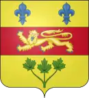 У золотому полі між двома синіми геральдичними ліліями та гілочкою з трьох листків клена, червоний пояс, на якому золотий леопард.