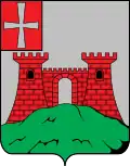 У синьому полі щита на вершині зеленої трапецієподібної гори, яка виростає знизу, срібна руїна замку у вигляді вежі зі стрільчастою аркою брами, квадратним вікном у горі і фрагментами стін зліва і справа. У верхній правій частині щита на червоному тлі срібний хрест із розширеними кінцями.