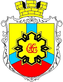«У лазуровому щиті — золоте колосся і золота половина шестірні [символи сільського господарства та с/г машинобудування] на ньому. На шестірні чорна назва міста українською мовою. У перетятій червоним та лазуровим главі [повторення барв прапора УРСР] — срібне коло із золотим серпом та молотом. У зеленій базі — золота старовинна гармата з трьома ядрами [символ історичного минулого міста].»