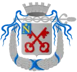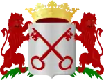 | Van zilver beladen met 2 sleutels van keel, geplaatst en sautoir. Het wapen gedekt met eene kroon met 5 fleurons, alles van goud en vastgehouden door 2 leeuwen van keel. |