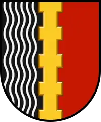 Герб являє собою щит іспанської форми, розтятий золотим зубчатим стовпом на чорне з нитяними хвилястими срібними стовпами і червоне поля.