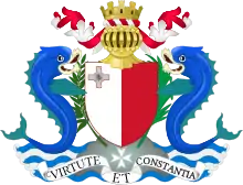 У 1964–1975 рр. на гербі було зображено два дельфіни, які тримали зображення прапора Мальти, обрамлені з одного боку пальмової, а з другого — оливковою гілкою, що означає відповідно перемогу і мир. Вгорі розташовувалася корона у формі фортеці з вісьмома восьмикутними баштами, поміщена на шолом з білою і червоною стрічками. Внизу — сині хвилі, що означають розташування в Середземному морі, восьмикінечний мальтійський хрест, пов'язаний з орденом Святого Іоанна, стрічка з девізом «Virtute et Constantia» (доблесть і стійкість). Нині цей девіз використовує орден Меріта.