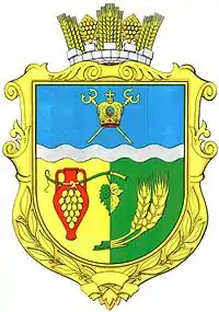 Даний герб затверджений був 13 квітня 2012 року рішенням сесії районної ради. Щит перетятий шиповидно и напіврозтятий. На першій синій частині золоті архієрейські жезл та посох в косий хрест, на які покладена золота митра, під ними — срібна нитяна шиповидна балка. На другому золотому полі червона амфора, на якій синє гроно винограду із зеленим листком. На другому і третьому зеленому полях два увігнутих розтятих зеленим і золотим колоски. Щит обрамований золотим декоративним картушем та увінчаний територіальною короною.
