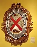 Блазон щита на першому гербі був таким: В сріблі, червоний андріївський хрест між червоною трояндою із зеленим листям, в основі бобром із гілкою, праворуч будяк з листям, ліворуч трилисник конюшини.[3] Девізом на сувої під щитом є Concordia Salus, латинська фраза, що перекладається як "порятунок через гармонію"[1] або французькою як "le salut par la concorde".