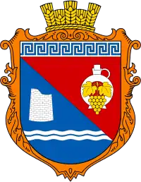 Щит скошений справа, у верхньому червонному полі срібний куманець, на якому золоте гроно винограду з двома листочками; у нижньому синьому полі срібна вежа Чобан-Куле, під якою йдуть дві срібні тонкі хвилясті балки; у срібній главі синій меандр.