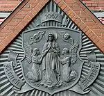| Гербом міста Мінська є бароковий щит, в блакитному полі якого зображення Божої Матері на срібній хмарині в червоно-синьому вбранні, два янголи і два херувима. |