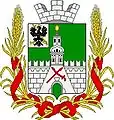На зеленому тлі частина міського муру з вежею, над якою шестипроменева зірка, а з боків — спис та шабля золоті.