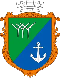 Щит скошений зліва; у верхньому зеленому полі срібні лопаті трьох вітрогенераторів, що зменшуються ліворуч, у нижньому синьому — чорний якір у срібній облямівці.