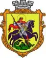 У щиті, розтятому червоним і лазуровим, розкрита срібна книга, на якій чверть золотої шестірні і золоте колосся в стовп. Золота глава обтяжена чорною назвою міста українською мовою.