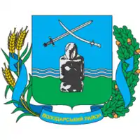 На лазуровому щиті з підвищеною зеленою хвилеподібною базою, тонко завершеною сріблом, два вузьких понижених срібних хвилеподібних пояса. Поверх всього чорний кам'яний обеліск, супроводжуваний зверху срібними мечем і шаблею, покладеними в косий хрест. Щит обрамлений вінком із золотих колосків і дубового листя, перевитим лазуровою стрічкою з написом "Нікольський район".