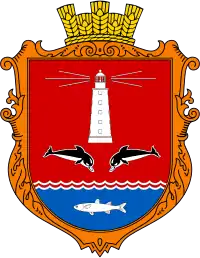 У червоному полі срібний маяк, під яким обабіч стрибають назустріч два срібно-чорні дельфіни, у відділеній двома срібними зазубреними нитяними балками синій основі пливе срібна риба.