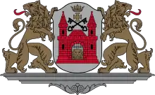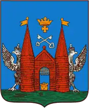 | У блакитному полі червона міська брама з піднятою ґратами, під якою золота левова голова, і двома баштами. Над брамою два навхрест покладених ключа, над ними золотий хрест під короною. |